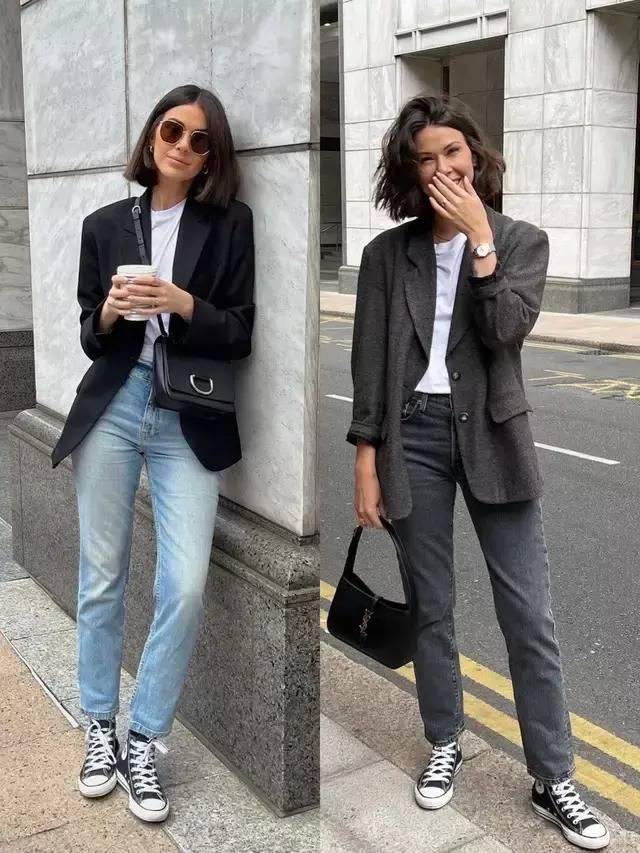 若是自己比较喜欢偏休闲的穿衣风格,那么就可以选择经典的白色或者是黑色帆布鞋,搭配上一条蓝色牛仔裤,灰色牛仔裤,就算穿上一件西装外套内搭白 T 恤,整体穿搭也不会显得枯燥呆板,反而让整体更显休闲洋气。
