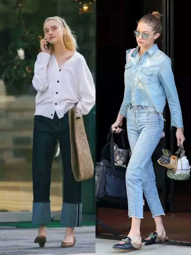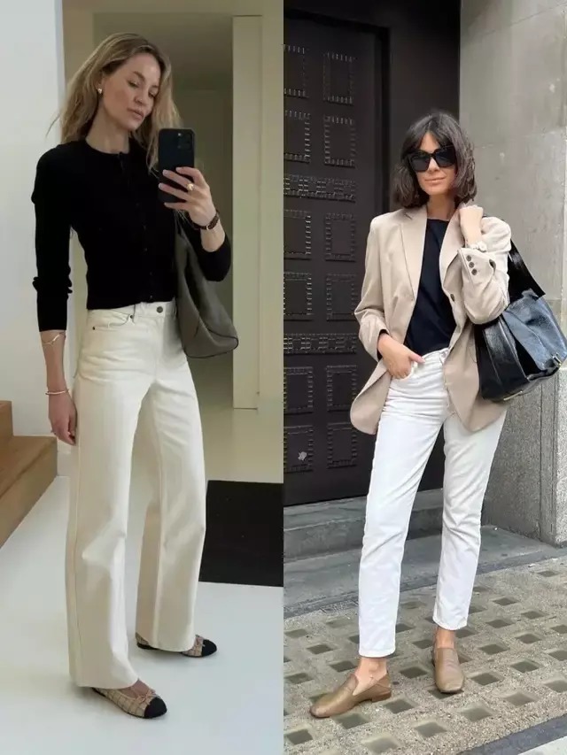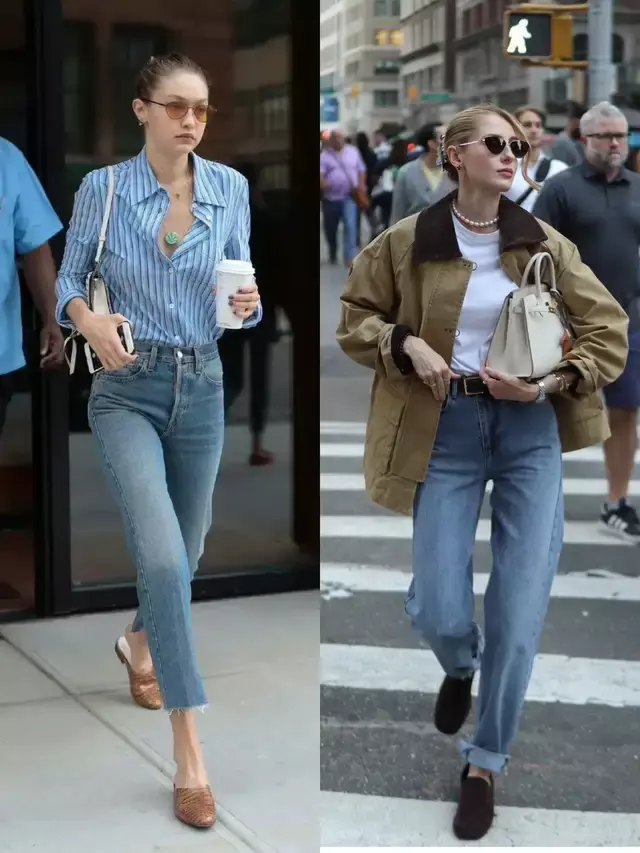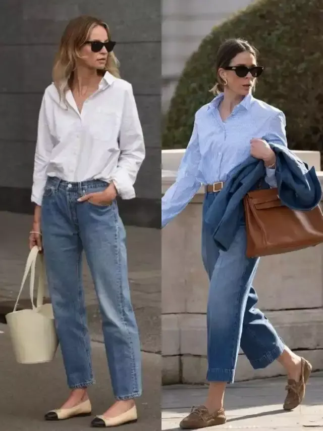 为了能增加造型的时尚度,我们也可以选择一双低饱和度的鞋子,比如说驼色的乐福鞋,卡其色和黑色拼接的玛丽珍鞋,搭配上蓝色牛仔裤和一件白色衬衫。蓝色衬衫温柔与利落得到完美平衡,这样的穿搭颜色造型低调又高级,看起来很有质感。