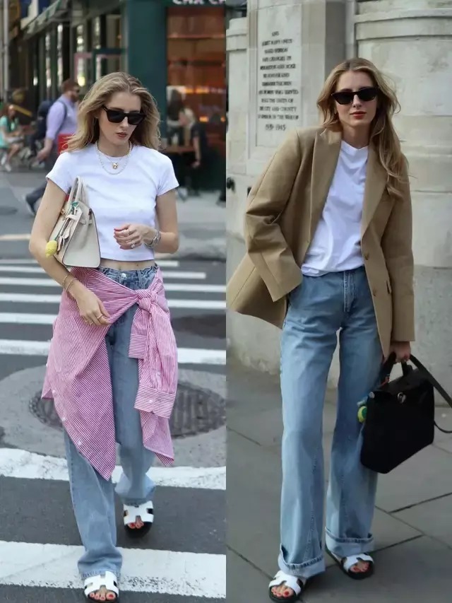 日常穿搭,出门逛个街,天气炎热的情况下,不想闷脚舒适一点,可选一双白色的凉鞋,配上牛仔直筒裤和白色短 T 恤。你可以用卡其色西装外套来组合,这样会显得利落,也可以用粉色衬衫扎在腰间,更显俏皮。