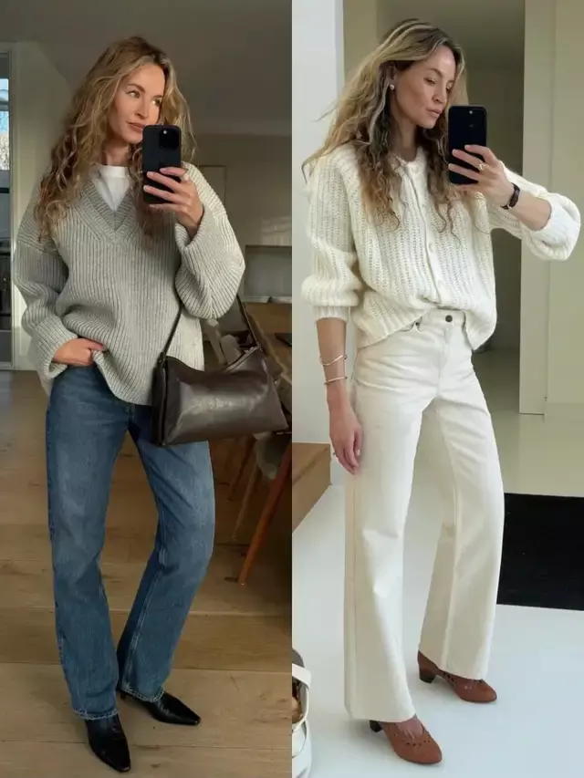 当我们穿上一双黑色的高跟短靴和蓝色牛仔直筒裤时,瞬间让整体穿搭偏一点轻熟的气质感,上半身搭配一款灰色毛衣和一件白色 T 恤,瞬间提升造型的层次感,视觉上更显高级。